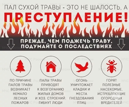 Напоминаем об опасности пала травы! Несанкционированные поджоги напрямую угрожают жизни и здоровью человека, а также могут привести к уничтожению жилых домов и хозяйственных построек, предприятий, птиц и животных.