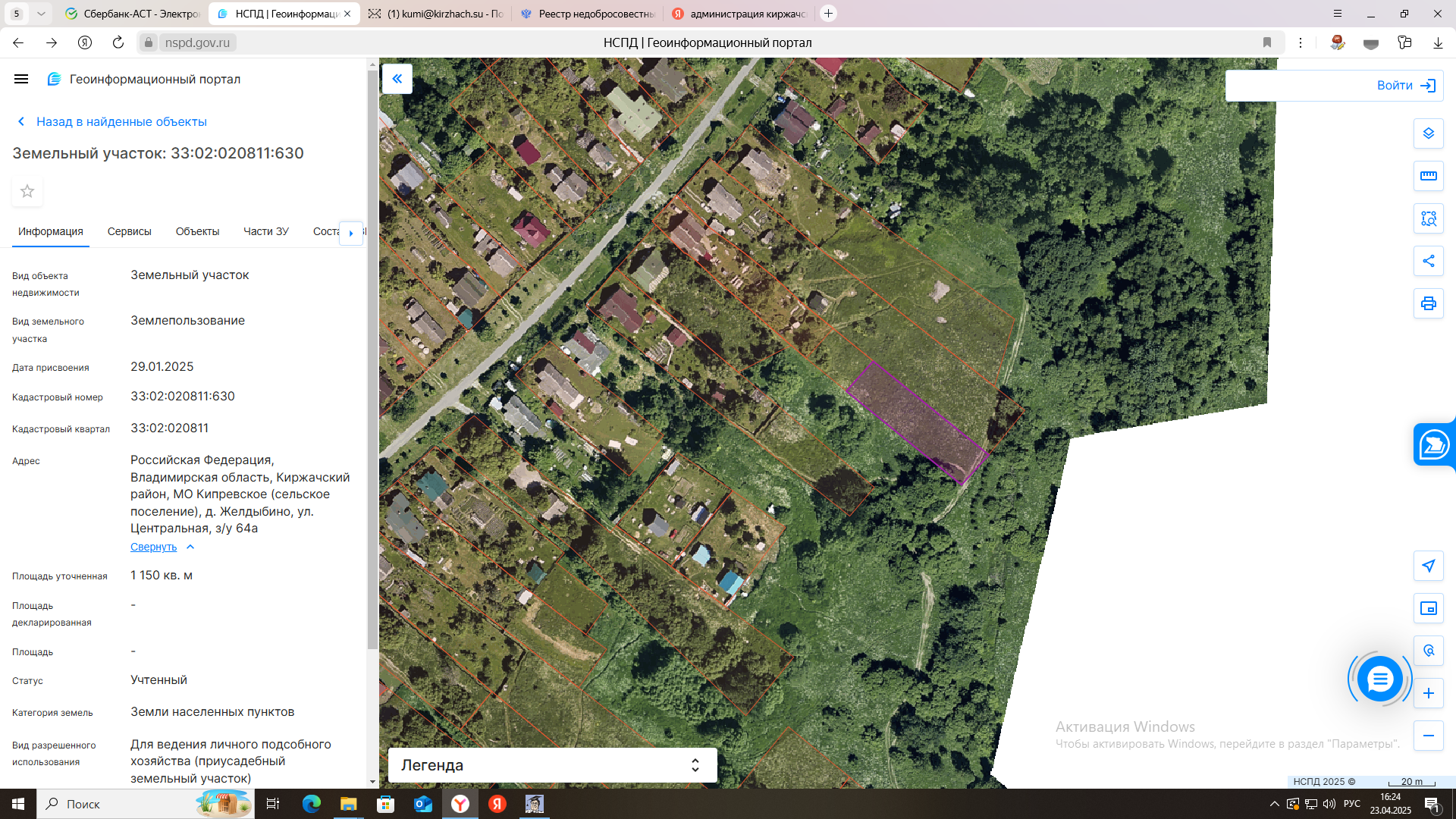 электронный аукцион на право заключения договора аренды земельного участка на срок 20 лет с кадастровым номером 33:02:020811:630 площадью 1150 кв. м, из категории земель населенных пунктов, с разрешенным использованием: для ведения личного подсобного хоз |