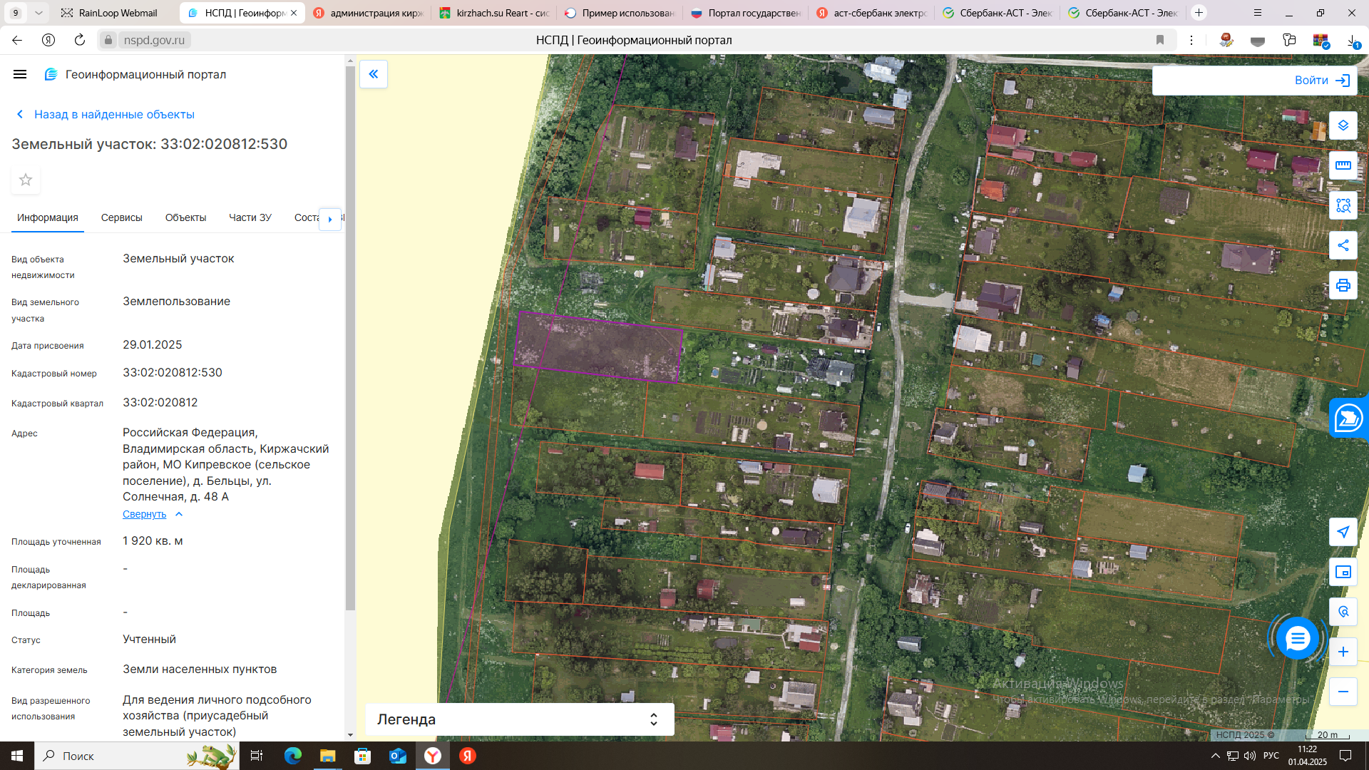 электронный аукцион на право заключения договора аренды земельного участка на срок 20 лет с кадастровым номером 33:02:020812:530 площадью 1920 кв. м, из категории земель населенных пунктов, с разрешенным использованием: для ведения личного подсобного хозяйства (приусадебный земельный участок), расположенного по адресу: Российская Федерация, Владимирская область, Киржачский район, МО Кипревское (сельское поселение), д. Бельцы, ул. Солнечная, д.48 А |