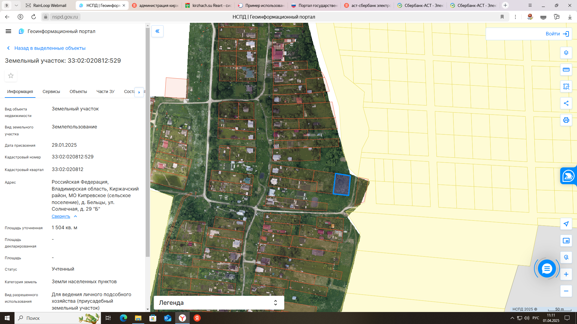 электронный аукцион на право заключения договора аренды земельного участка на срок 20 лет с кадастровым номером 33:02:020812:529 площадью 1504 кв. м, из категории земель населенных пунктов, с разрешенным использованием: для ведения личного подсобного хозяйства (приусадебный земельный участок), расположенного по адресу: Российская Федерация, Владимирская область, Киржачский район, МО Кипревское (сельское поселение), д. Бельцы, ул. Солнечная, д.29 «Б». |